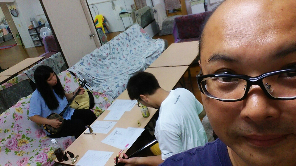 お父さん、なかなか慣れない指の動きと工工四を覚えるのに悪戦苦闘!!